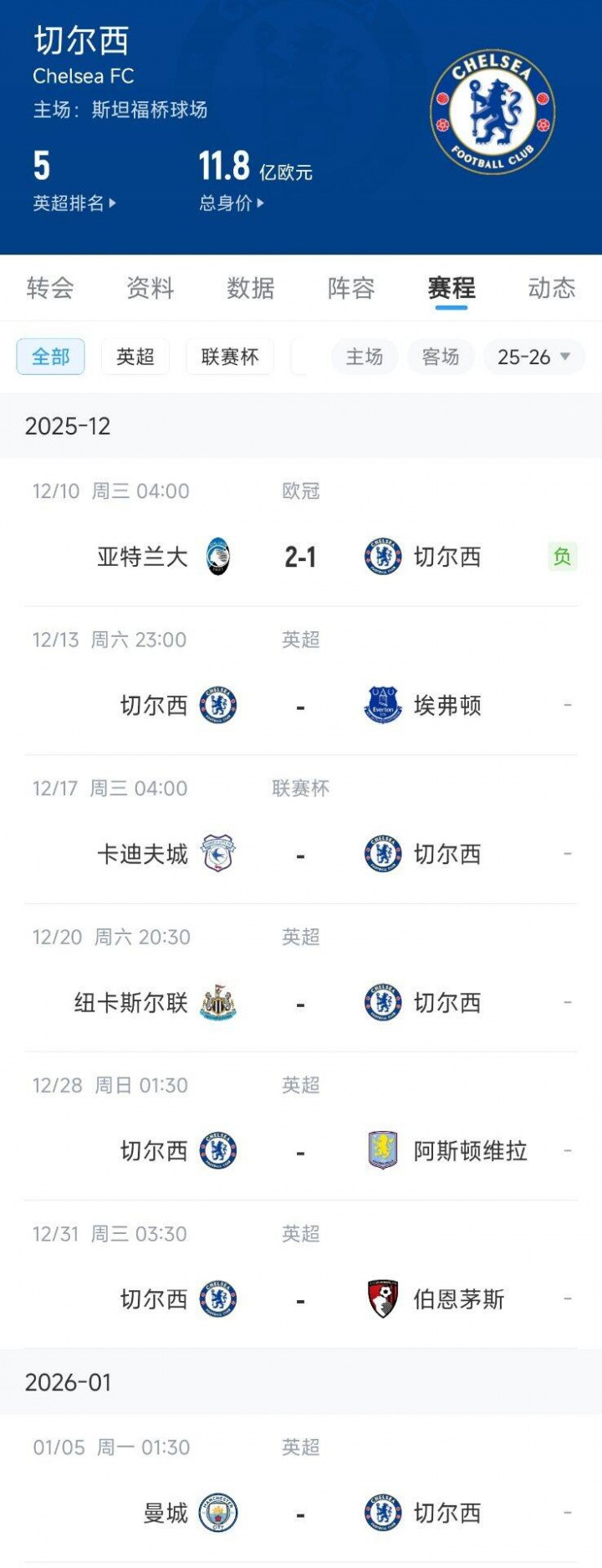 切尔西后续赛程:埃弗顿、卡迪夫城(联赛杯)、纽卡、维拉、伯恩茅斯、曼城……