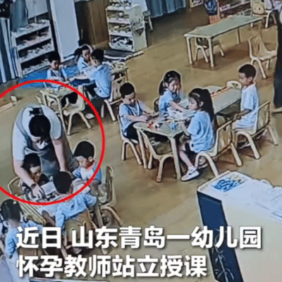 青岛一家幼儿园的监控画面,这几天悄悄刷屏。没有脚本、没有摆拍,镜头里只有一个挺着孕肚的老师半蹲着给孩子讲绘本,额角冒着细汗。