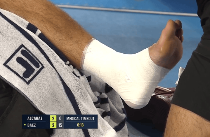 首盘比赛2-2平时,阿尔卡拉斯救球过程中脚踝出现伤势,在经过包扎后重新投入到比赛。