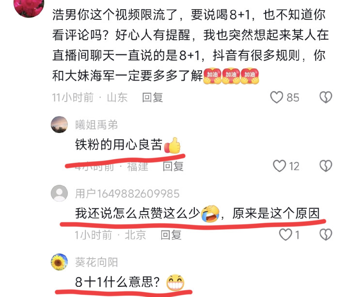 这位网友说: 浩男你的这个视频限流了,要说喝8+1,不能说喝酒这些规则你一定要铭记。